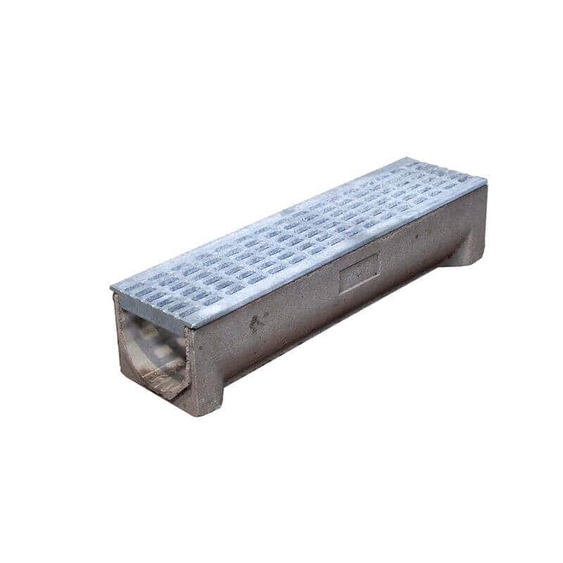 Dette Aquadræn er lavet af holdbar polymerbeton og leveres med en aftagelig galvaniseret støbejernsrist, der er sikret med låseklemmer.