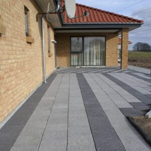 Store fliser til indkørsel giver et roligt og moderne udtryk med færre fuger. Store formater giver en mere ensartet flade og passer godt til nyere boliger og indkørsler med lige linjer. Når du vælger store fliser skal du være opmærksom på, at formatet stiller større krav end mindre fliser. Belastningen fra biler fordeles over færre fliser, og derfor er både flisens styrke og underlag afgørende for et godt resultat. De store fliser bruges til indkørsler, hvor der ikke er store niveauforskelle, da det er svært at lave et naturligt fald. De bruges ofte i lige forløb eller snoede indkørsler. De store formater kan nemt kombineres med mindre formater eller belægningssten langs kanter og ved overgange. Det kan give en ekstra stabil kant, især hvis man støber langs kanten, som vi anbefaler.