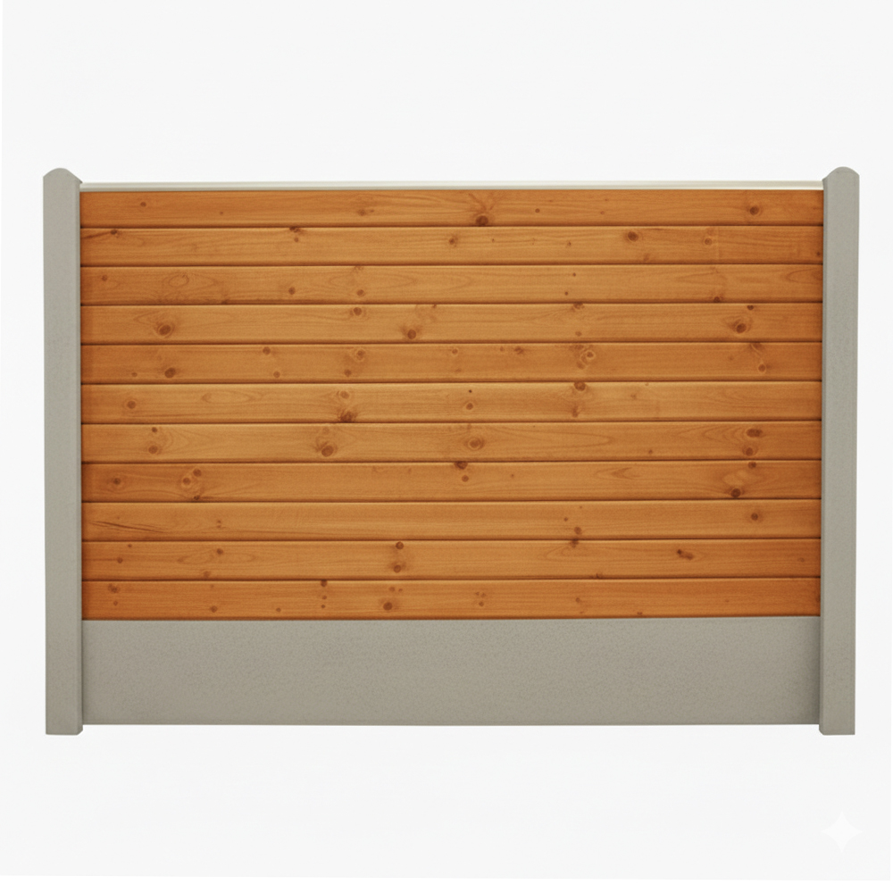 Hegnet monteres med robuste, danskproducerede betonstolper i en flot grå betonfarve. Stolperne er armerede for maksimal styrke og holdbarhed og har præcise falser, hvor brædderne nemt kan indsættes for en sikker og stabil samling. Stolperne har en afrundet top, der giver hegnet et stilrent og elegant udtryk. I bunden af hegnet sikrer en armeret betonbundplade på 4x30x189 cm, at træet ikke har direkte kontakt med jorden, hvilket forlænger levetiden og beskytter mod fugt.