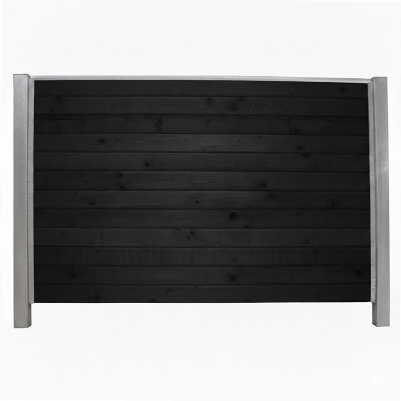 Hegnet monteres med kraftige stålstolper, der måler 80x80 mm i bredden og har en højde på 270 cm. Stolperne har en godstykkelse på 2 mm, hvilket sikrer maksimal styrke og lang levetid. De leveres med plasttoppe og sideskinner, der nemt skrues fast med de medfølgende selvskærende skruer, hvilket gør monteringen enkel og sikker. Kombinationen af de sorte træprofiler og de stærke stålstolper giver hegnet et minimalistisk og moderne udtryk.