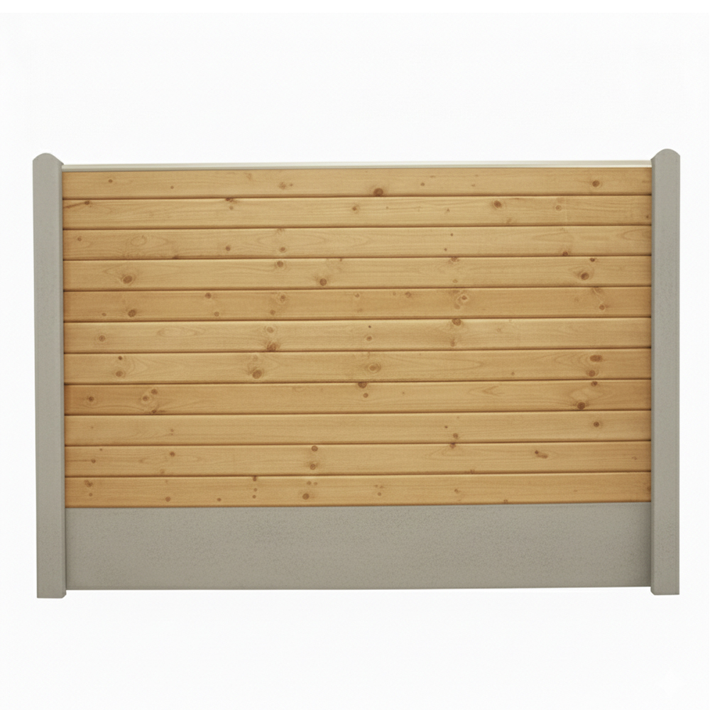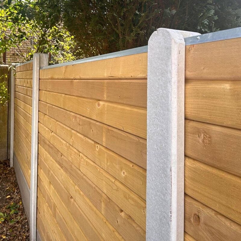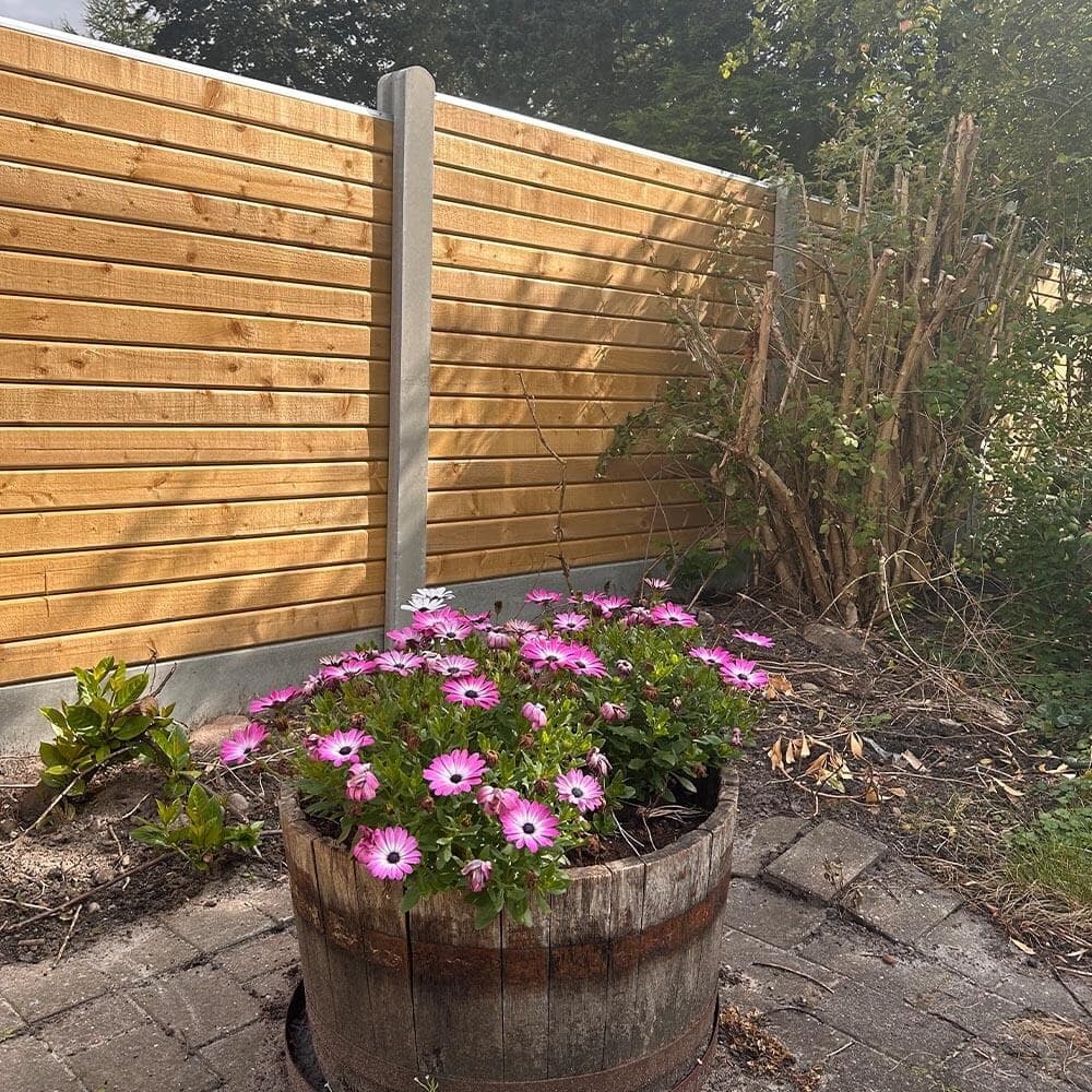 Hegnet monteres med robuste, danskproducerede betonstolper i en flot og neutral grå betonfarve. Stolperne er armerede for maksimal styrke og holdbarhed og har præcise falser, der gør det nemt at indsætte brædderne sikkert og stabilt. Stolperne har en afrundet top, hvilket giver hegnet et elegant og gennemført udtryk. I bunden af hegnet sikrer en armeret betonbundplade på 4x30x189 cm, at træet ikke har direkte kontakt med jorden, hvilket beskytter mod fugt og forlænger levetiden.