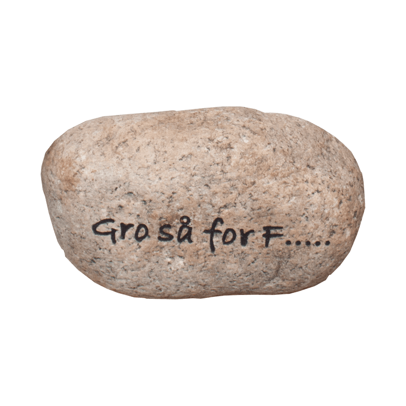 Pyntestenen med teksten “For for f…..” er lavet af smuk gul/rød natursten og har en længde på ca. 25 cm. Den er indgraveret med en flot og tydelig skrift, der læser “Gro så for f….”