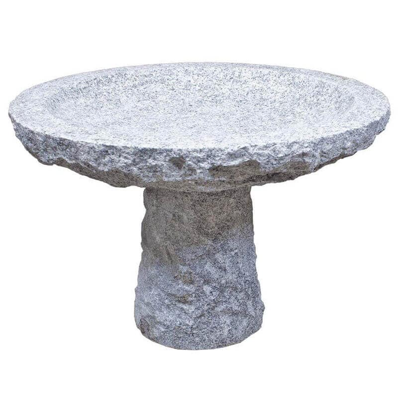 Fuglebadet er let at samle, da det kommer i to dele. Skålen er lavet af glat poleret sten og har en dybde, der er passende til fuglene at bade i og drikke vand fra. Rundt om skålen sidder en naturlig stensokkel, der giver fuglebadet en rustik og autentisk følelse.
