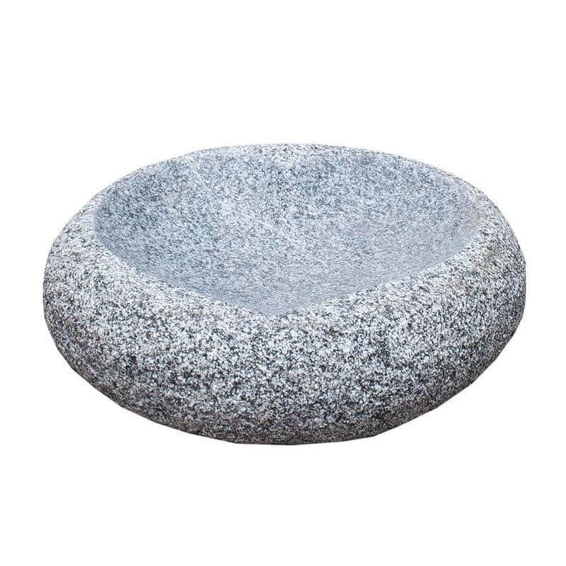Fuglebadet er lavet af grå granit, hvilket giver det et rustikt og naturligt look, der passer til enhver haveindretning.