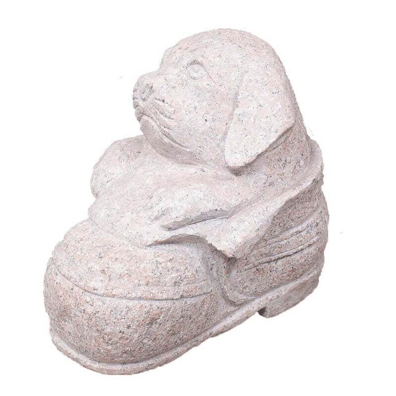 Vores smukke hund i støvle er en vidunderlig tilføjelse til din have eller indendørs indretning. Hunden og dens støvle er skåret med flotte detaljer, som giver dem et livligt udseende og en følelse af bevægelse. Den røde granit sten er en holdbar og naturlig sten, der vil modstå årstidernes skift og vejrforhold. Hundens længde på 35 cm gør den til en fremtrædende figur, der vil fange opmærksomheden fra enhver besøgende.