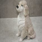 Denne flotte siddende hund er udført i rødlig granit og er en imponerende syn med dens højde på omkring 45 cm. Hundens udseende er yderligere forbedret med skåret og poleret detaljer, der giver den et unikt og stilfuldt look. Hundens næse og øjne er mørke og står i kontrast til den rødlige granit, hvilket tilføjer et visuelt element til dette unikke stykke sten. Dette er en hund, der vil skille sig ud og tilføje et strejf af elegance til ethvert rum eller have, den placeres i.