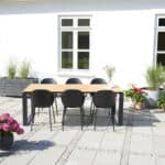 Bordpladen på “Lilly” bordet består af tre planker i teakfarvet nonwood, et innovativt materiale, der kombinerer det naturlige udseende af træ med holdbarheden og vedligeholdelsesfriheden i syntetiske materialer. Nonwood har den ekstra fordel at være UV-resistent og modstandsdygtig over for fugt og insekter, hvilket gør det til et ideelt valg til udendørs møbler.