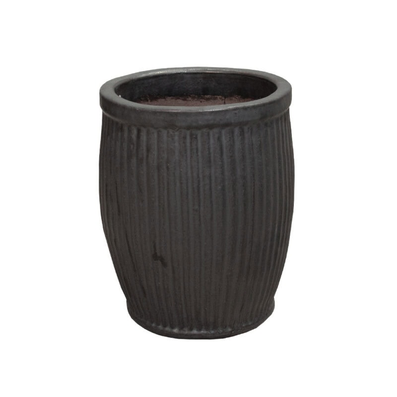 Brændt ved 1200 grader bliver krukken ekstremt modstandsdygtig og kan modstå frost, når den behandles korrekt. Den matte sorte farve passer smukt ind i både moderne og klassiske uderum – og de vertikale riller tilføjer ekstra dybde og karakter.