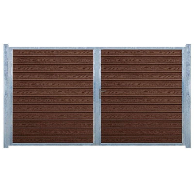 - Stabile stolper: Dobbeltlågen fuldendes med to solide stålstolper, der er toppet med et diskret sort plastik design, komplementerende de brune brædders naturlige udseende.