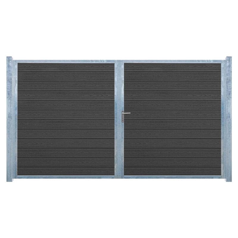 Ønsker du en elegant og funktionel indgang til din have eller gård? Vores dobbeltlåge med sorte blokhus brædder og robuste stålstolper har både moderne udseende og design.