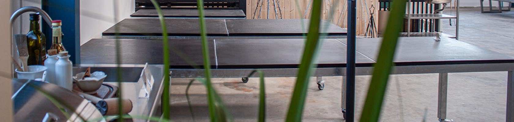 De galvaniseret haveborde fås med keramik bordplade, skifercoated eller med betonfliser.