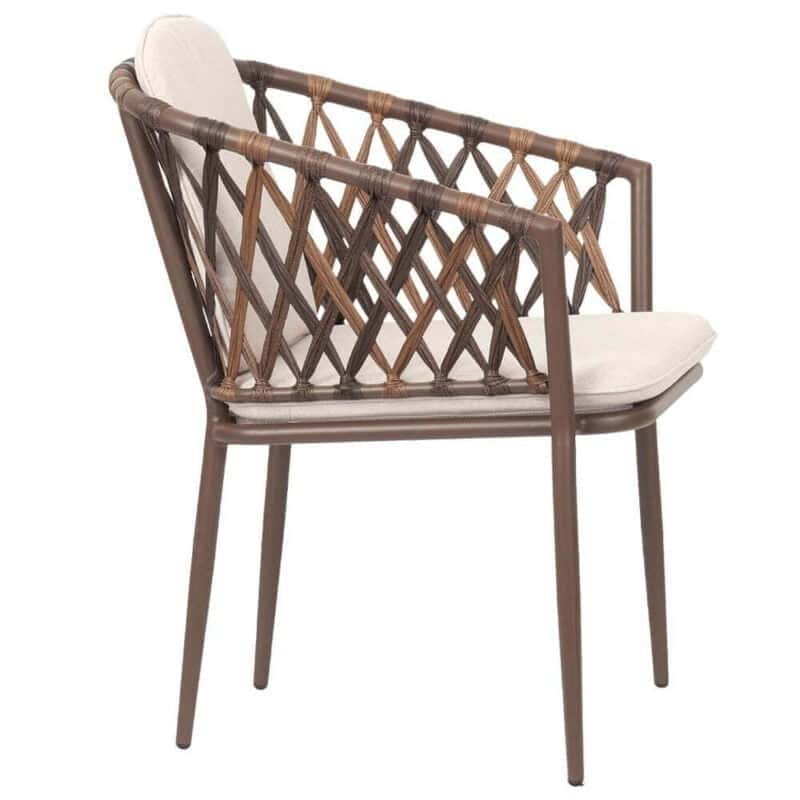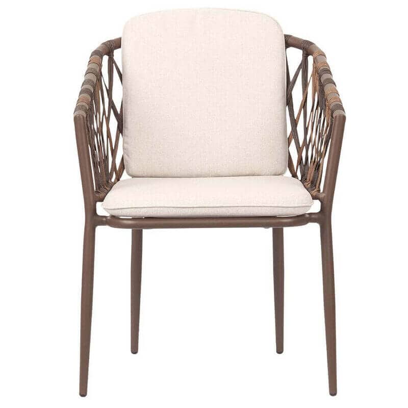 Stolens stel er lavet af brunligt aluminium, et materiale, der er både let og robust, og det er kendt for sin modstandsdygtighed overfor korrosion, hvilket gør det til en ideel løsning for udendørs møbler. Siderne på stolen er flettet med brunlig rattan, der tilføjer en naturlig, varm og indbydende appel til designet. Rattan er et ekstremt holdbart og vejrbestandigt materiale, hvilket gør det perfekt til brug i udendørs møbler.