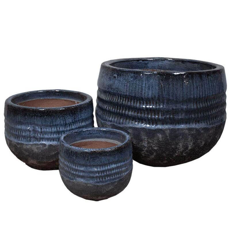 Hver krukke i dette sæt er omhyggeligt håndlavet med ekspertise og kærlighed, hvilket sikrer et unikt og karakterfuldt udseende. Den smukke blå sorte farve giver en følelse af ro og harmoni, der vil komplimentere enhver udendørs indretning. Krukkens glaserede overflade er både stærk og holdbar, hvilket sikrer, at den bevarer sin skønhed i årevis.