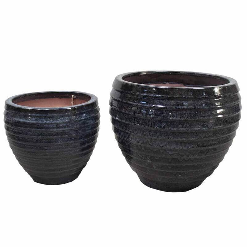 Hver krukke i dette sæt er nøje håndlavet med omhu og ekspertise, hvilket sikrer et unikt og karakterfuldt udseende. Den smukke blå farve udstråler friskhed og vitalitet, og de rillede flader, der strækker sig langs hele krukkerne, tilføjer en moderne og dynamisk æstetik. Den runde form af krukkerne skaber harmoni og balance i dit uderum.