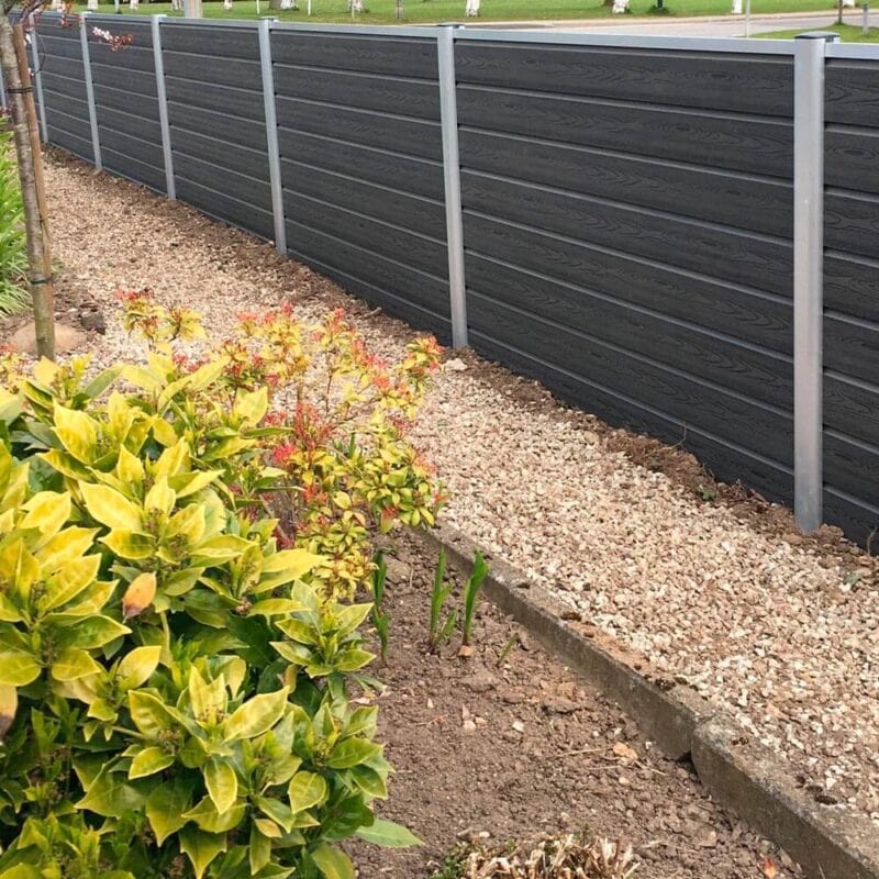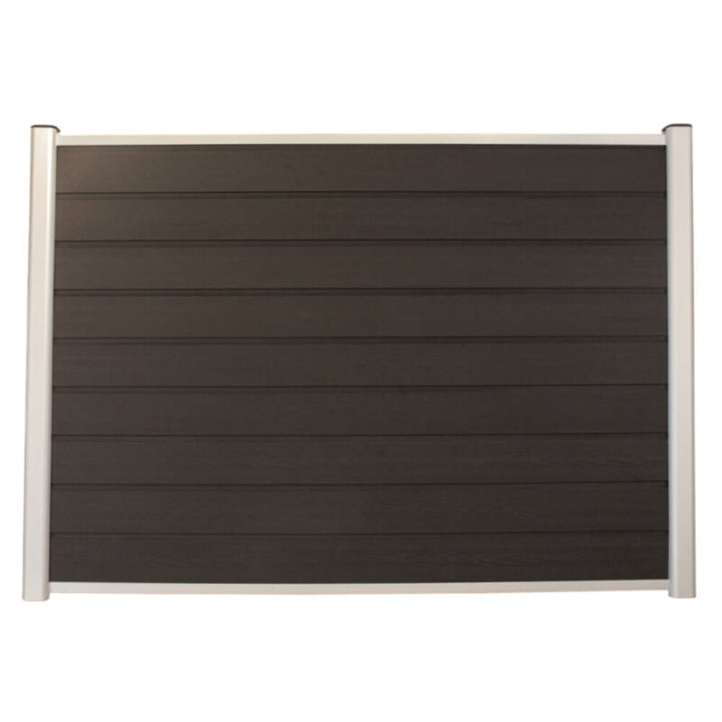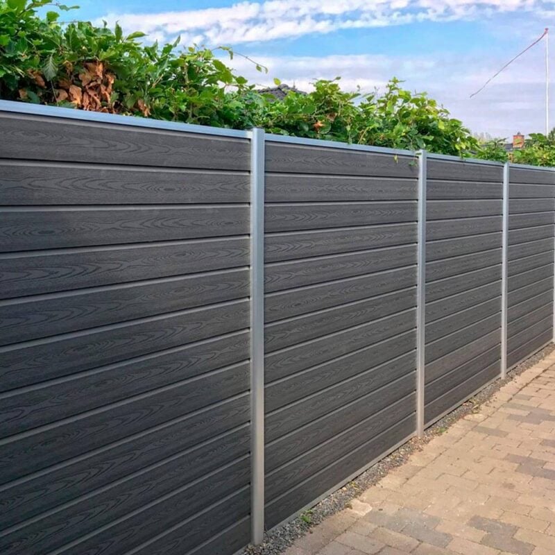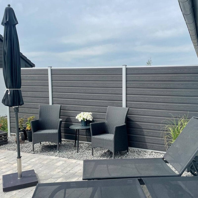 Skab en moderne og stilren afskærmning med kompositprofil lige i sort, kombineret med alufarvede alustolper for et flot og vedligeholdelsesfrit hegn. Den stærke konstruktion sikrer maksimal stabilitet, mens de vejrbestandige materialer giver en lang levetid uden behov for vedligeholdelse.