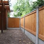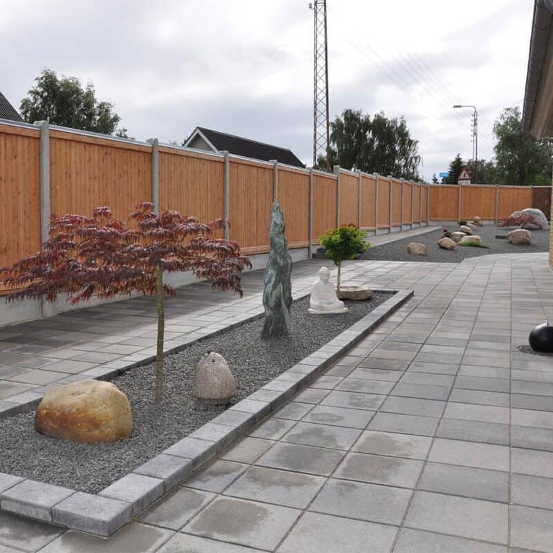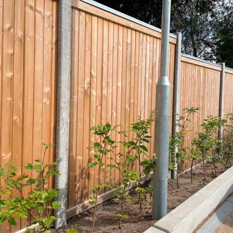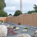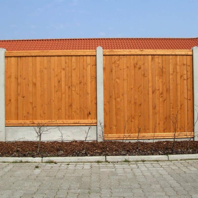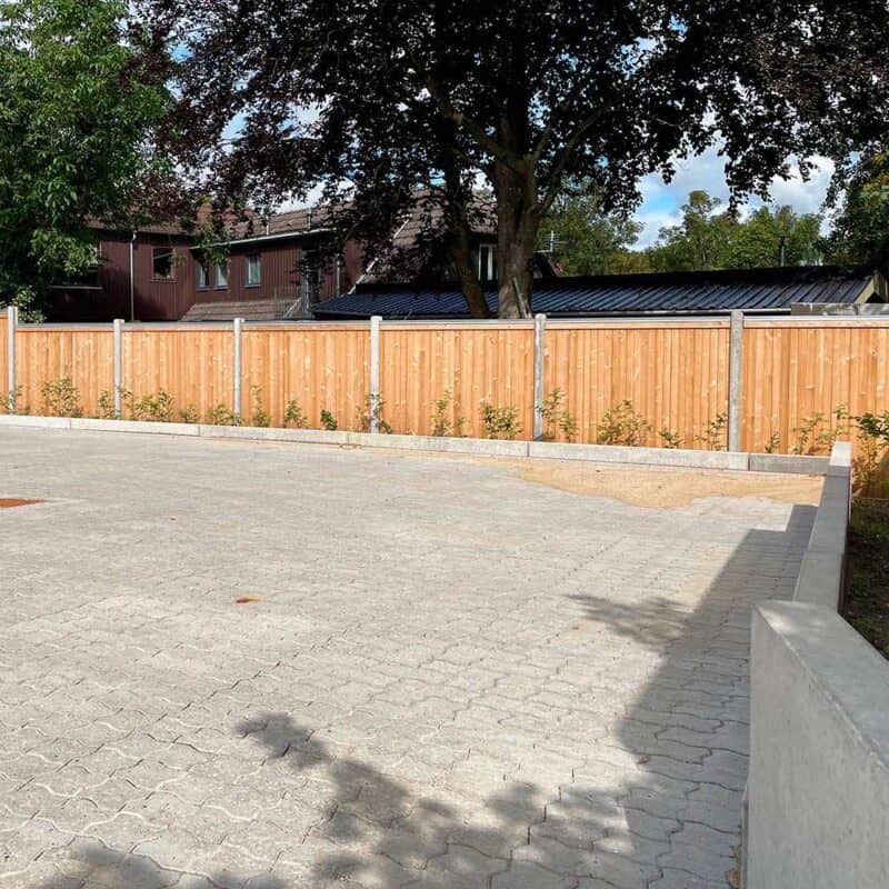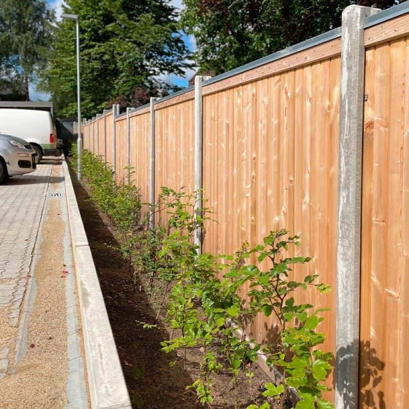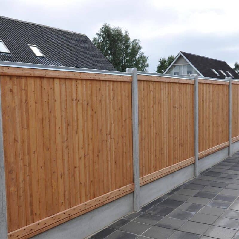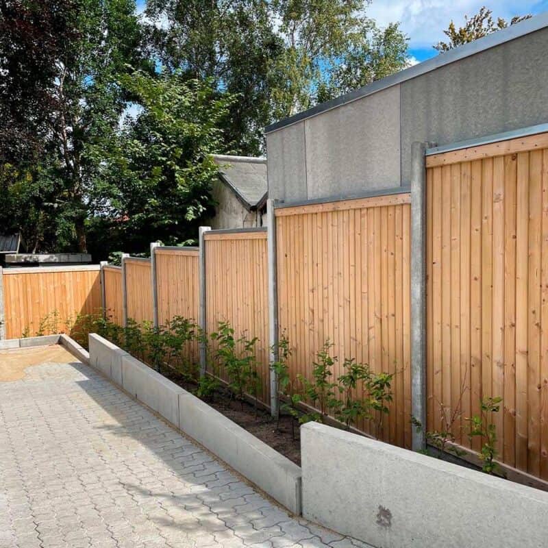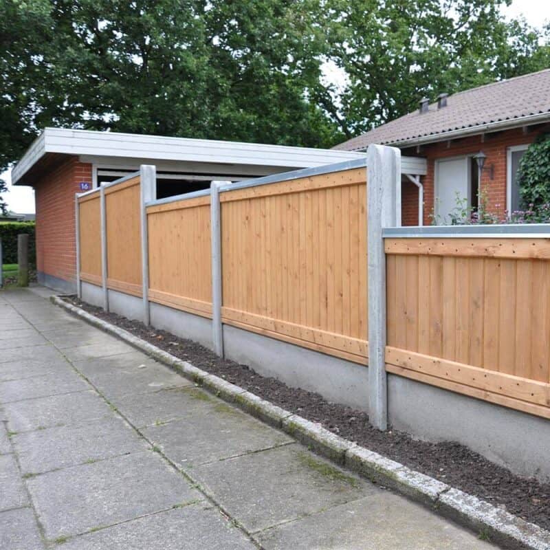 Hegnet monteres med robuste, danskproducerede betonstolper i en klassisk grå betonfarve. Stolperne er armerede for maksimal styrke og holdbarhed og har præcise falser, hvor lægtehegnet nemt kan indsættes for en stabil og sikker konstruktion. Stolperne har en afrundet top, der tilfører hegnet et stilrent og harmonisk udtryk. I bunden af hegnet sikrer en armeret betonbundplade på 4x30x189 cm, at træet ikke har direkte kontakt med jorden, hvilket beskytter mod fugt og forlænger levetiden.
