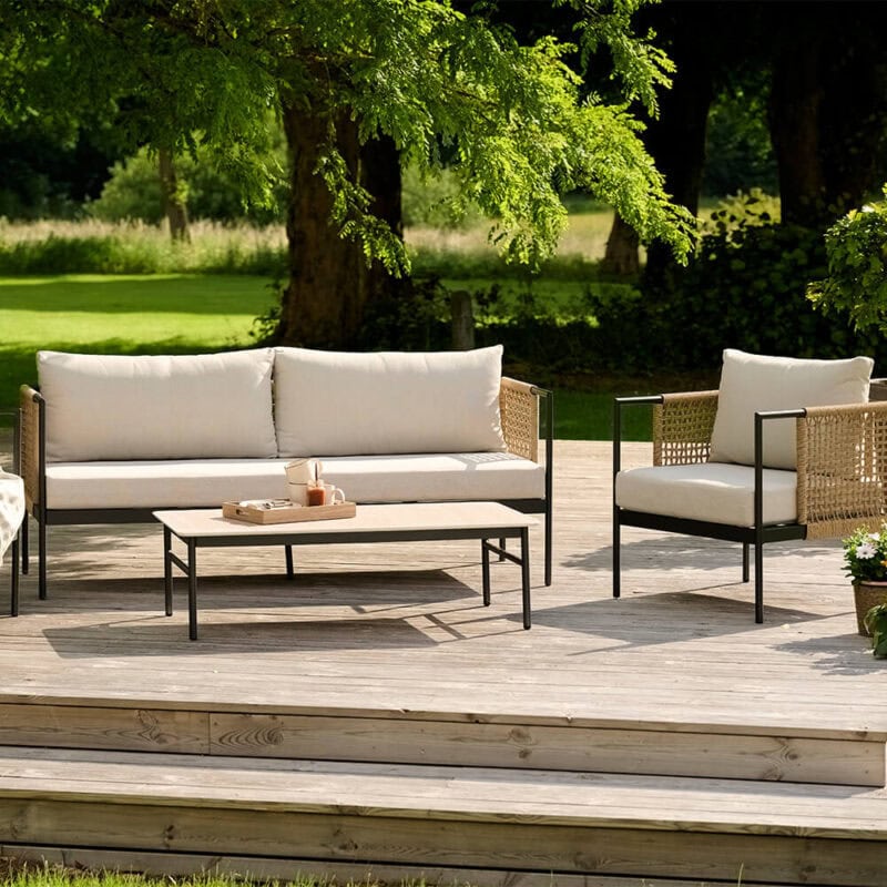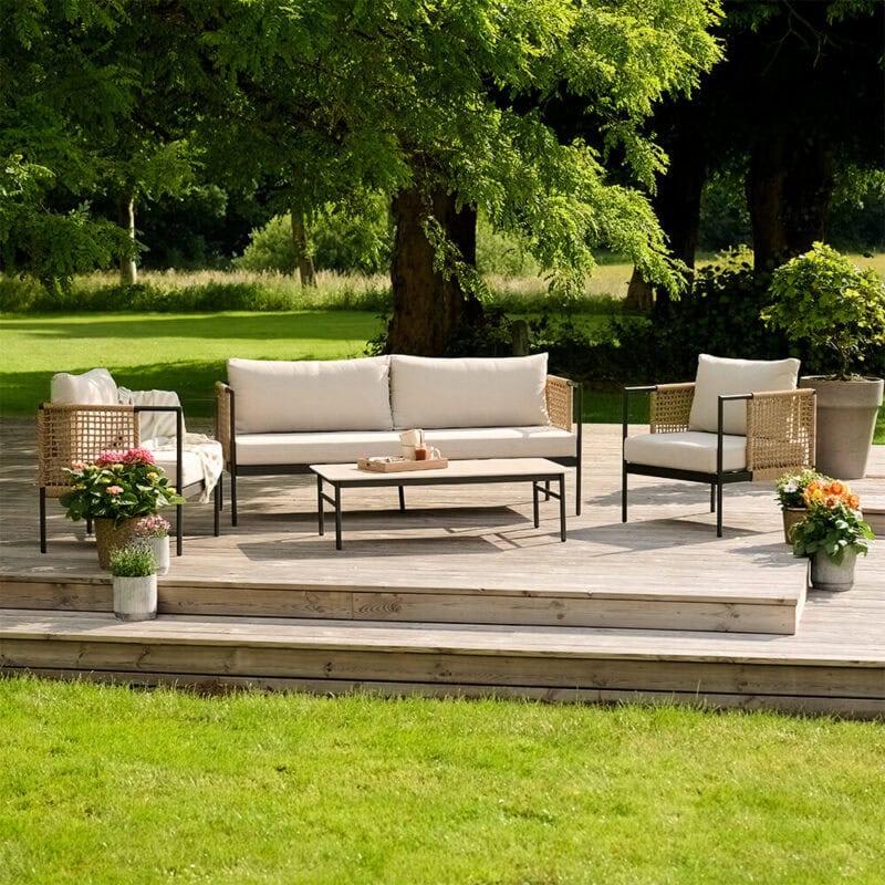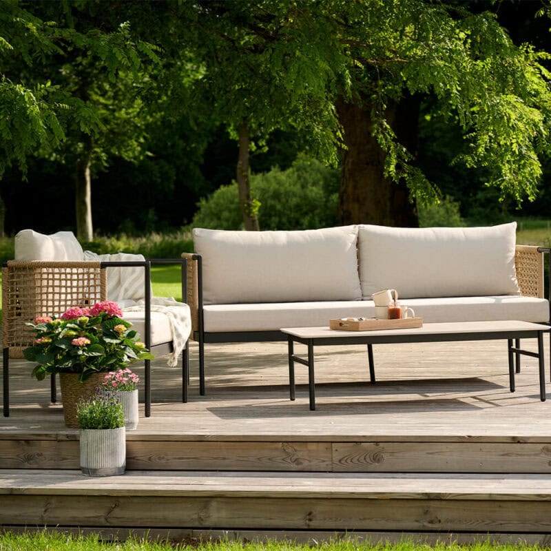 Skab en stilfuld og afslappet stemning på terrassen eller i haven med loungesættet “Moly”. Med sin elegante kombination af sort aluminium, naturfarvet flet og bløde puder i støvet beige, giver dette loungesæt en skandinavisk lethed og tidløs charme.