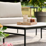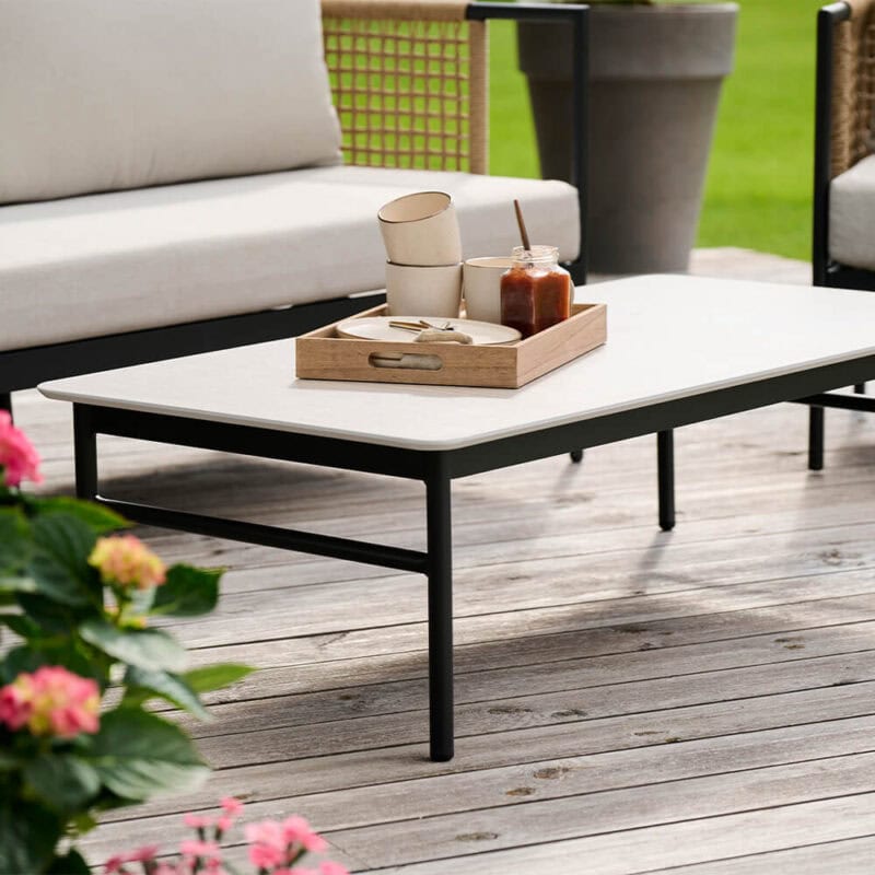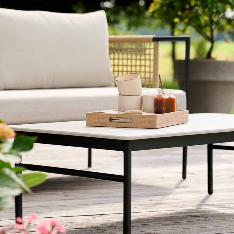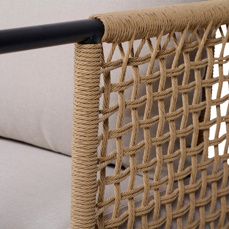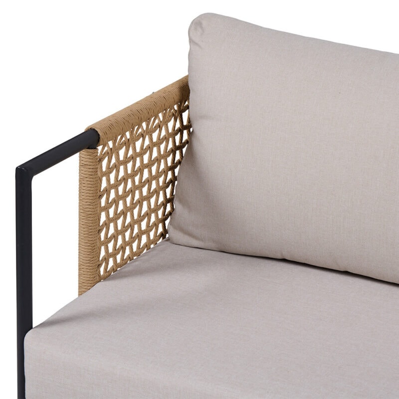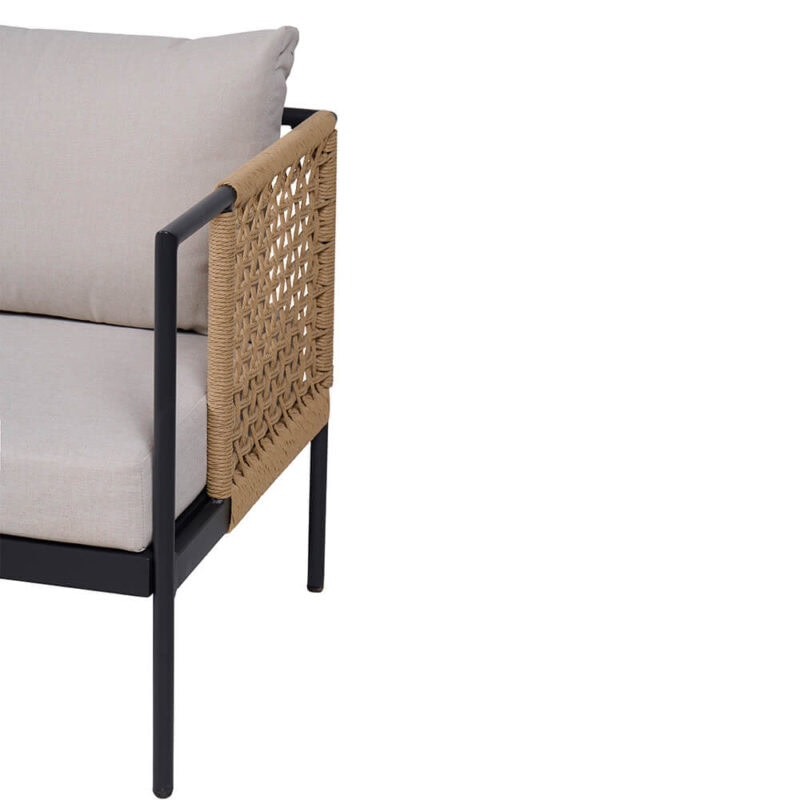 Det sorte stel i aluminium med metallic coating sikrer lang levetid og stabilitet, mens det luftige naturflet tilføjer et varmt og naturligt udtryk. Komforten er sikret med bløde polyesterhynder, der er PFAS-fri, og som giver en indbydende siddeoplevelse. Det matchende bord har en stilren letvægtsbordplade og sorte plastikbeskyttere under benene, så underlaget skånes.