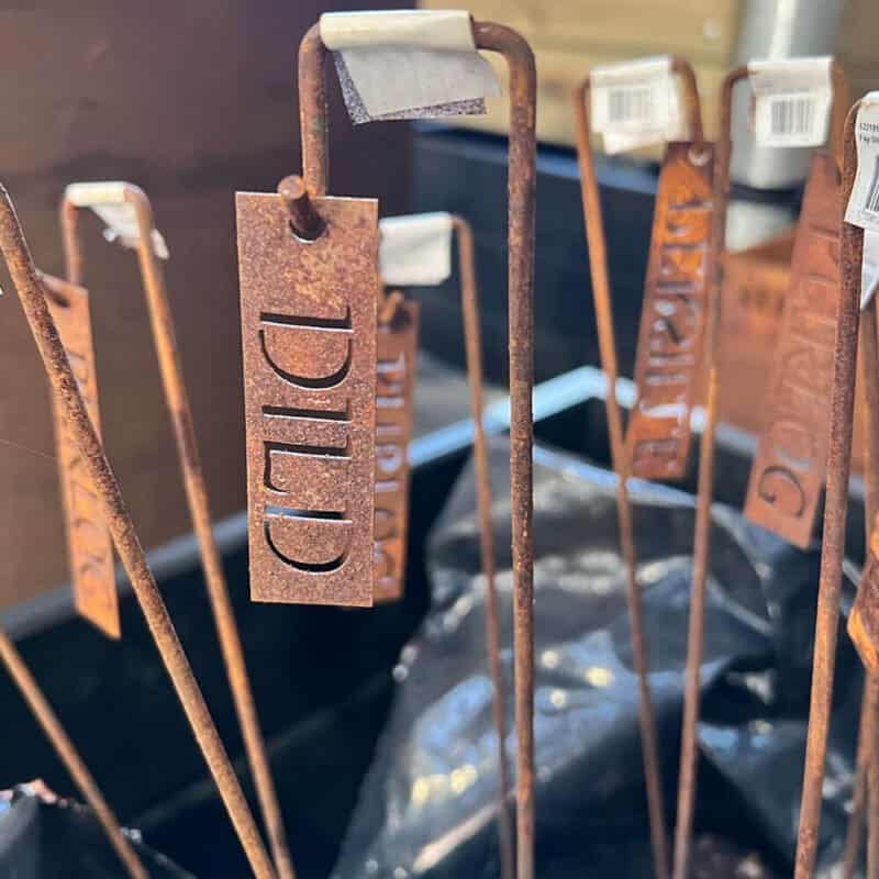 Vores rustfarvede planteskilt på 50 cm højde og med en dybde på 2,5 cm – et perfekt tilbehør til din have.