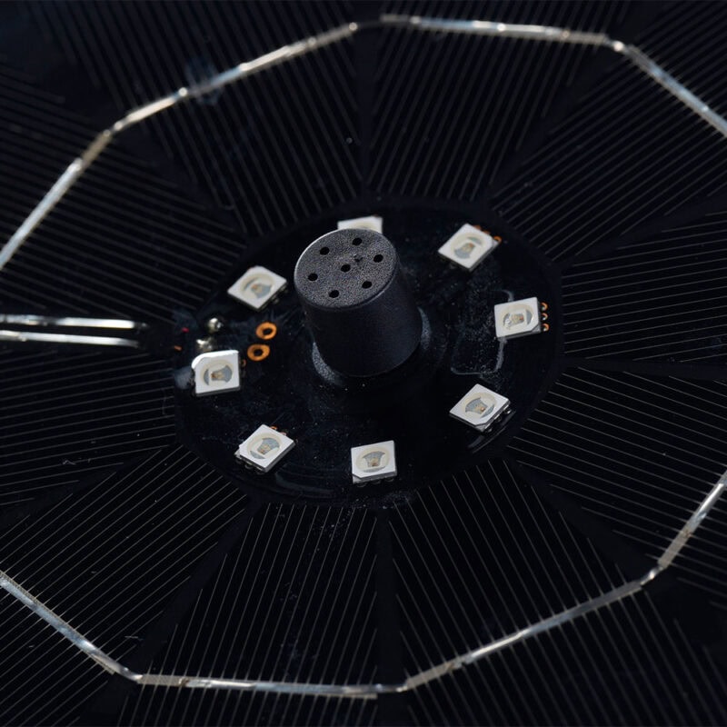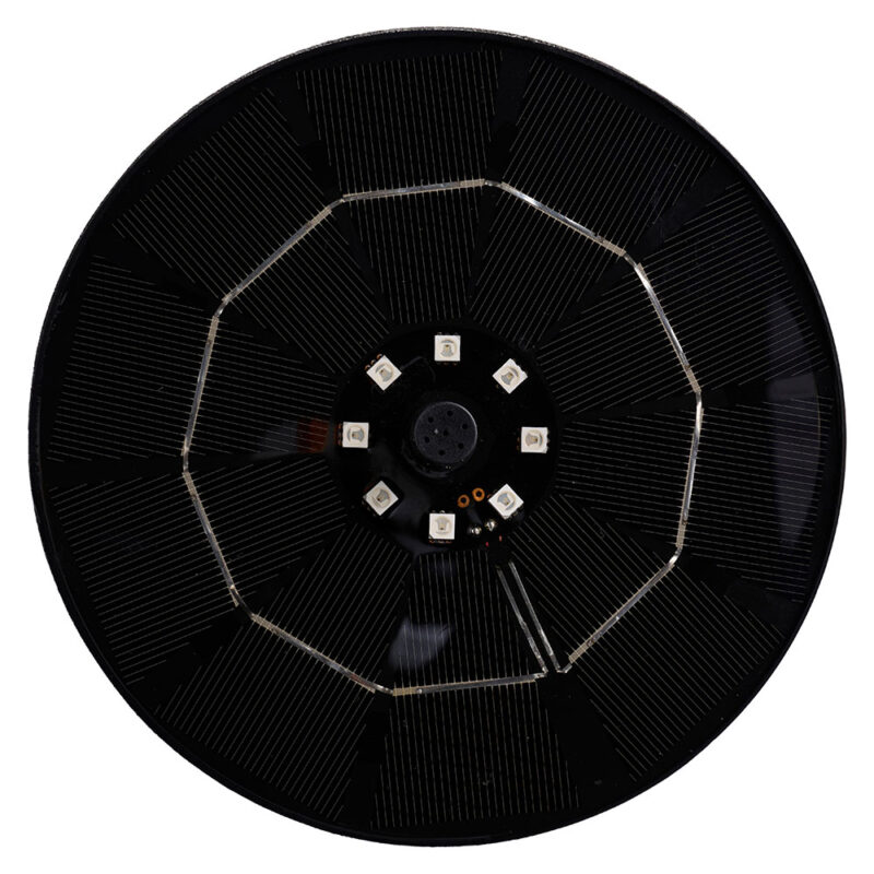 Solfontæne med 8 indbyggede LED-lys, som automatisk tænder når det bliver mørkt og giver en smuk lyseffekt i vandet. Fontænen fungerer både dag og nat, så længde det indbyggede genopladelige 18650 (1200mAh, 3.7V) Li-batteri er opladet af solen.