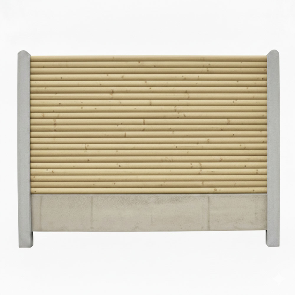 Hegnet leveres med grå betonstolper, der har indstøbte falser, så rafterne let kan placeres uden ekstra monteringstilbehør. Denne metode sikrer en robust og vedligeholdelsesfri løsning, der holder i mange år uden behov for vedligeholdelse.