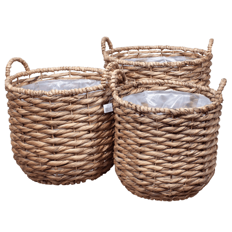 Sættet inkluderer tre kurve i forskellige størrelser, der passer perfekt til dine behov. Den mindste kurv har en diameter på 33 cm og en højde på 30 cm, hvilket gør den perfekt til små planter eller blomsterarrangementer. Placer den på dit bord, i vindueskarmen eller på hylden for at tilføje et subtilt og elegant touch til dit indretningsmiljø.