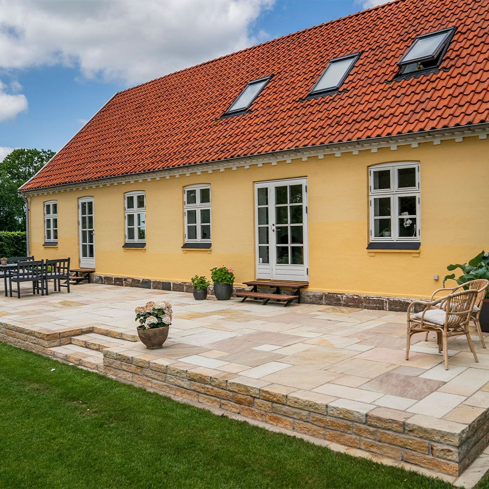 Men disse fliser er ikke bare smukke at se på, de er også ekstremt holdbare. Sahara sandstenen tåler salt og kan renses med højtryksrenser, hvilket gør den utrolig let at vedligeholde. Uanset om du bor i et område med mange regndage eller har brug for at rense terrassen for at fjerne snavs, vil overfladen ikke ændre sig.