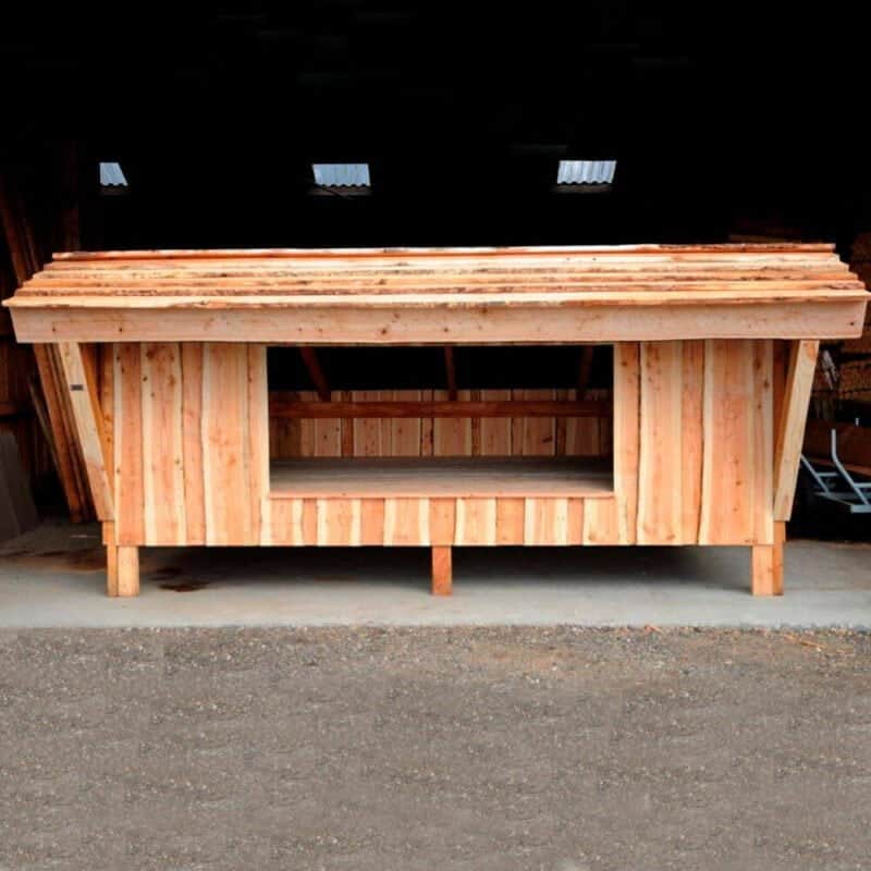 Shelteren leveres enten med færdig samlet front, sider og bagbeklædning eller usamlet. Shelteren er nem at montere med de medfølgende skruer og undertag. Bunden er lavet af høvlet lærketræ, der giver en behagelig og solid overflade at sove på, og taget er lavet af Kalmar lærketræ, som giver en smuk og naturlig overflade.