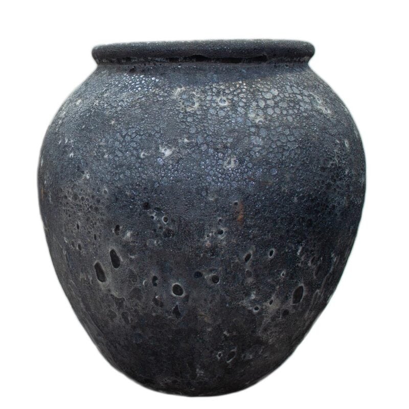 Den karakteristiske sorte overflade med et slangeskinds-lignende mønster skaber en unik struktur, der fanger lyset og giver krukken en markant visuel effekt.