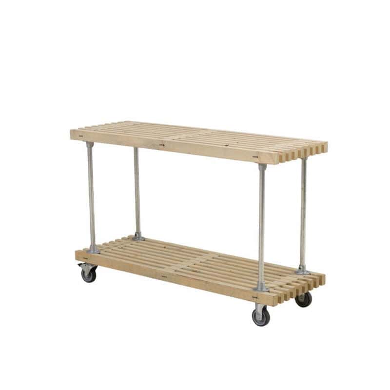 Produktet er råt og rustikt, derfor kan der forekomme harpiksudtræk og revner i træet. Der er mulighed for at efterspænde trallerne via de gennemgående gevindstænger.