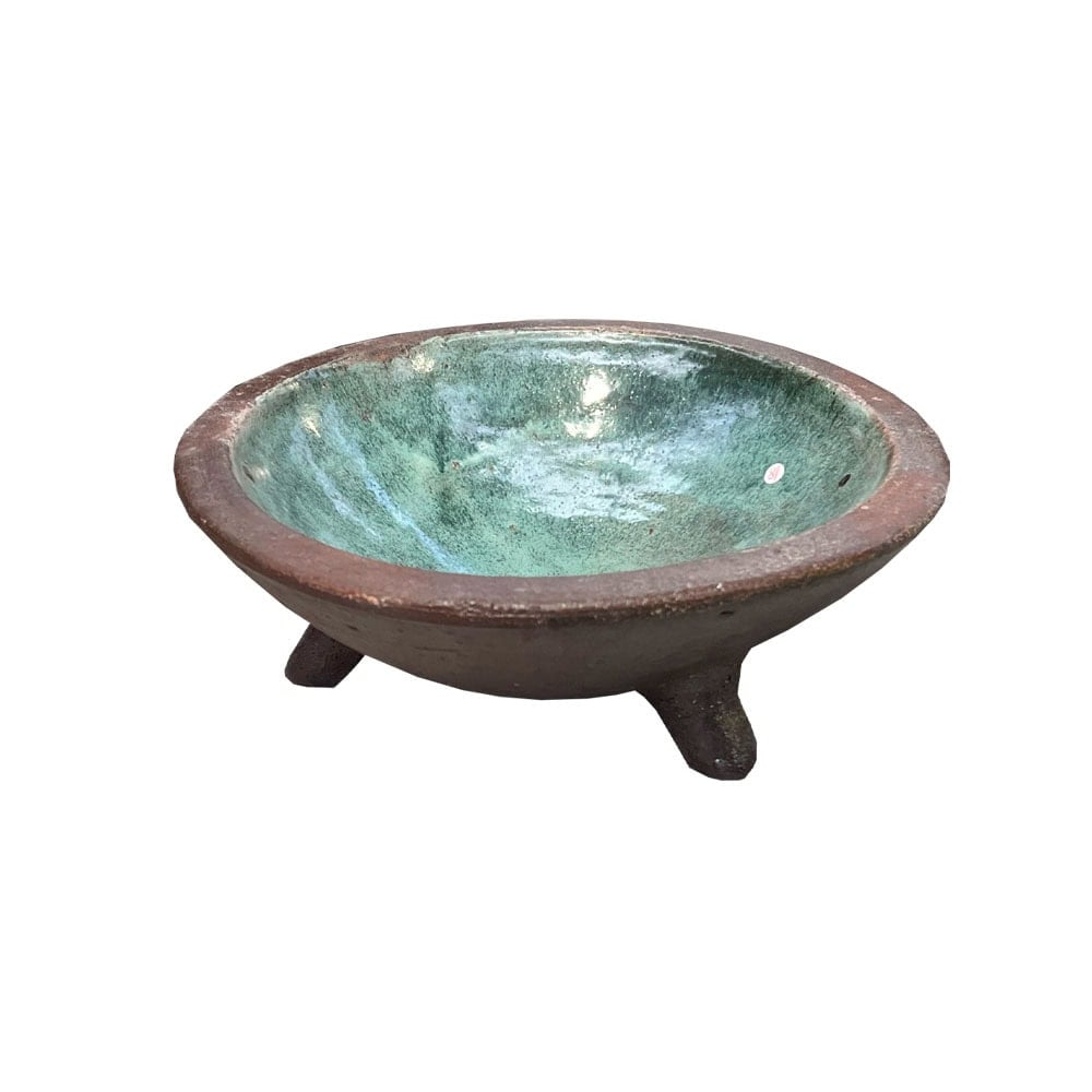 Ariel er et dekorativt vandfad med tre små ben. Det har en brun, naturlig yderside og en glaseret skål i en blågrøn nuance, der giver et flot farvespil.