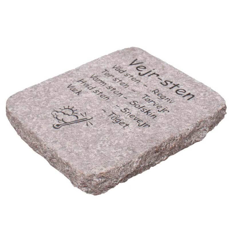 Stenen måler 30 cm i bredde og 35 cm i længde, og dens rosa farve tilføjer et smukt og unikt udseende til enhver udendørs plads. Med fem forskellige tekster på stenen, der fortæller dig, hvordan vejret er, er det nemt at aflæse vejret ved blot at kigge på stenen.